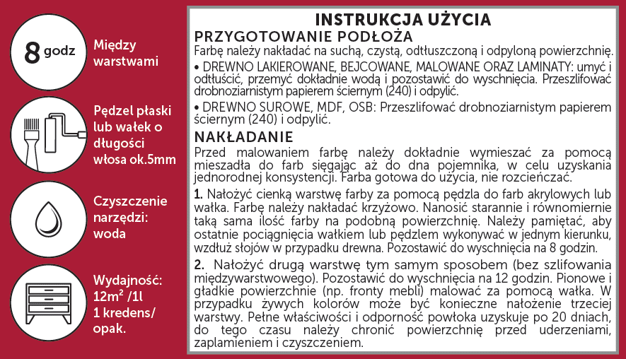 - Drewno lakierowane, bejcowane, malowane, płyta melaminowana, laminat: odtłuścić, spłukać i pozostawić do wyschnięcia. Zmatowić papierem ściernym o gradacji 240 i odkurzyć.